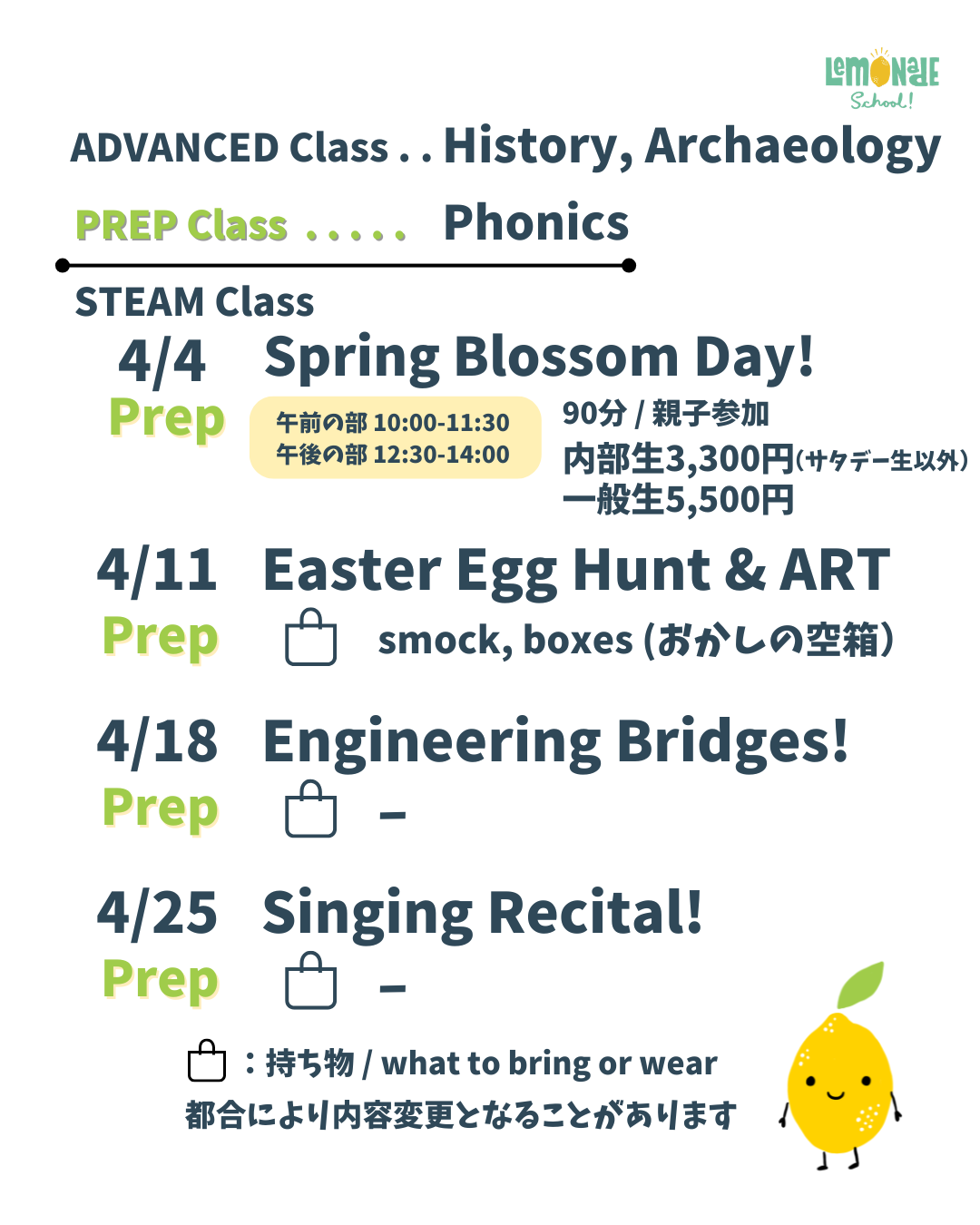 PREPクラスは、第一土曜日以外の土曜日にレッスンがあります(月平均3回)。