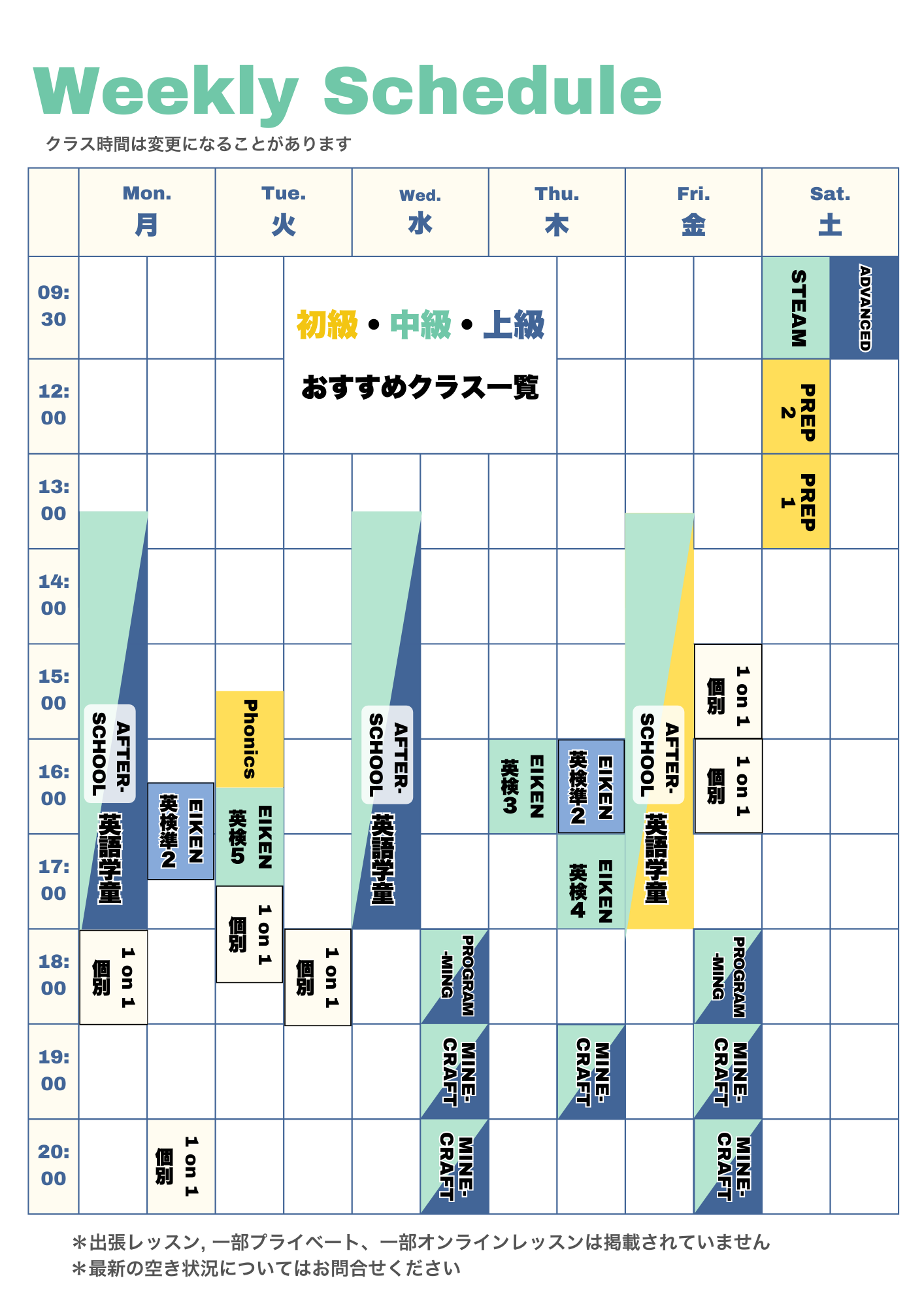 - 定期的に周遊Weekを設けています。その期間中は他のクラスにも入ることができます。